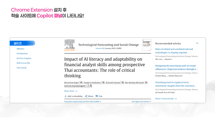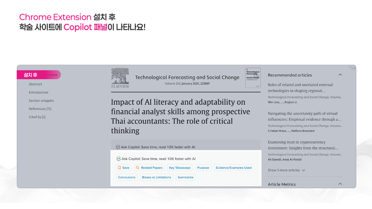 Google Scholar, PubMed, ScienceDirect 같은 실제 학술 사이트 환경 위에서 바로 작동하는 AI Copilot을 활용해, 논문을 읽기 전에 판단하는 새로운 연구 워크플로우를 제시합니다.